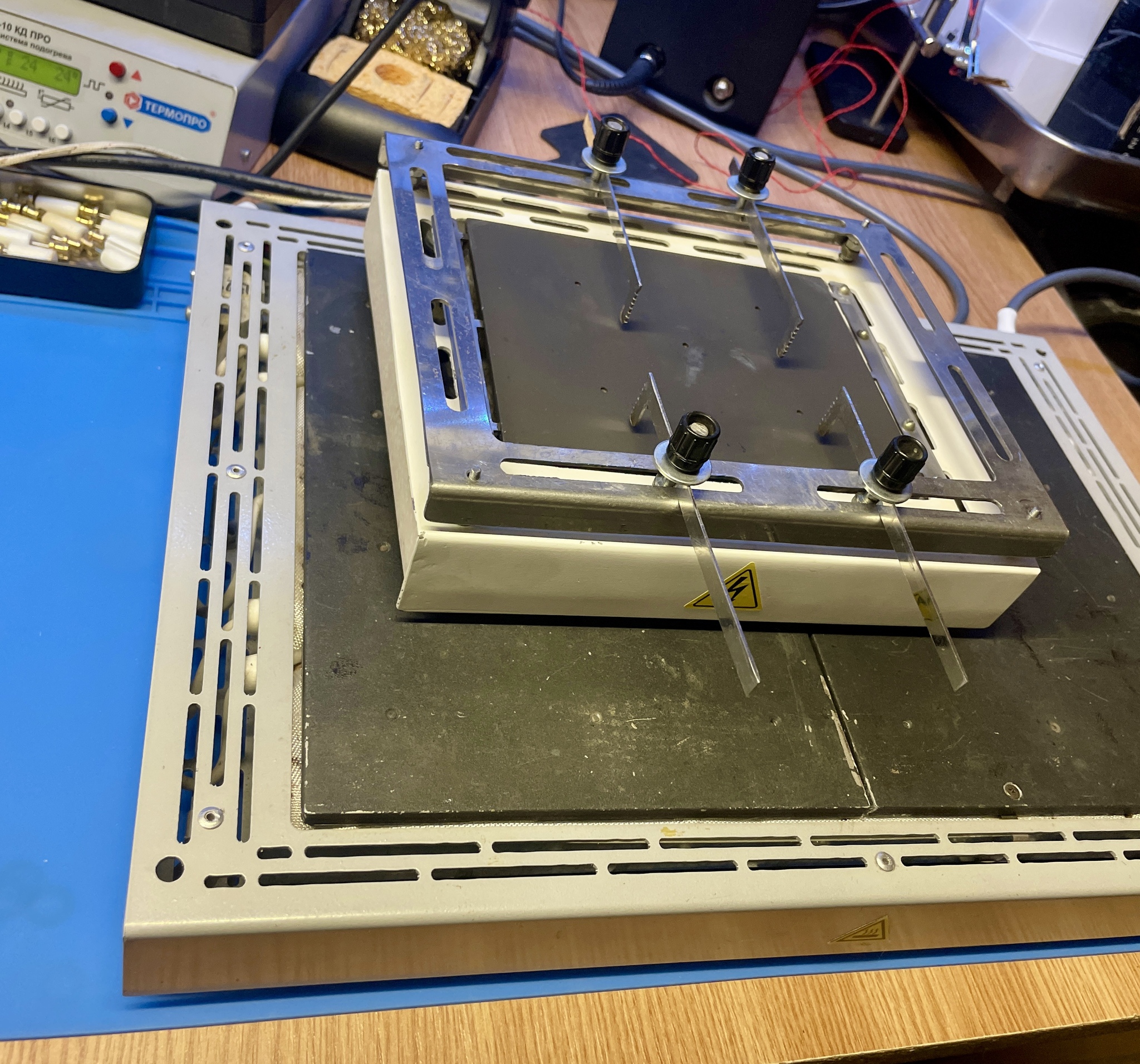 В качестве основы для моей станции я использовал нижний модуль Thermal Pro np34-24, приобретенный на вторичном рынке. Он работает в связке с родным контроллером TP 2-10 cd pro, оснащенным точным платиновым датчиком температуры. На мой взгляд, это одно из лучших готовых решений на рынке. Изначально я рассматривал вариант полностью самостоятельной сборки аналогичного модуля, вдохновляясь проектами компактных термофенов.