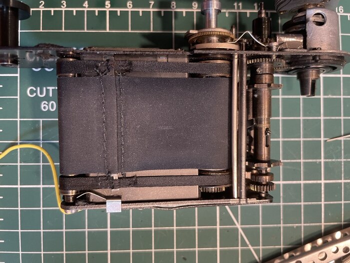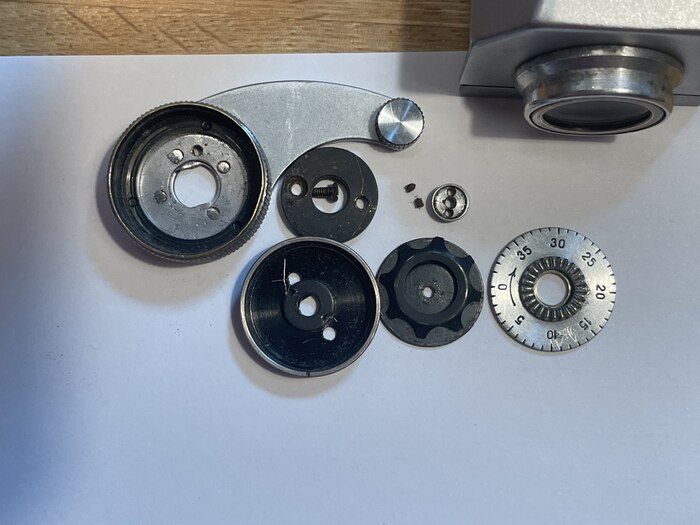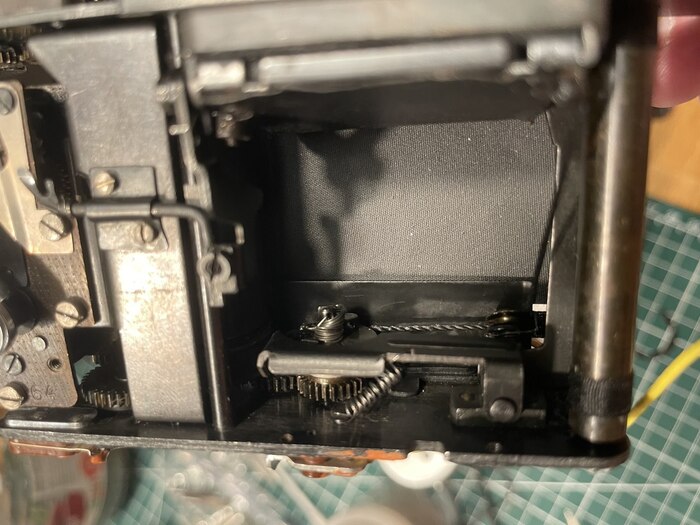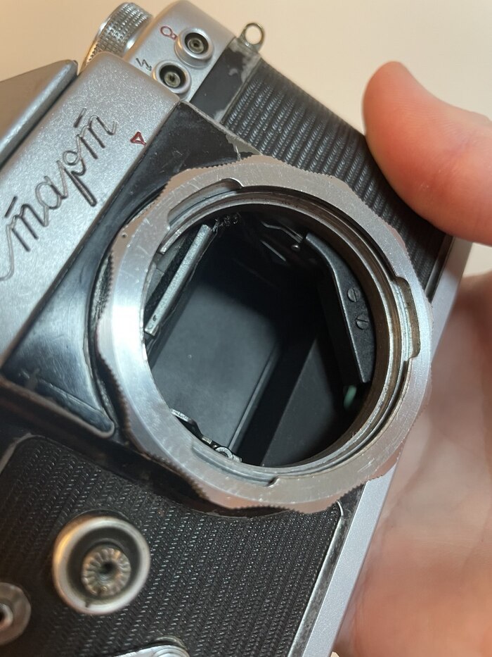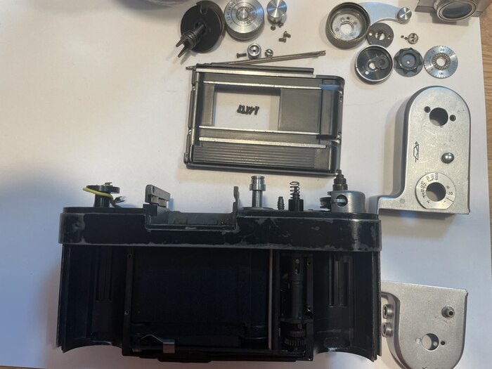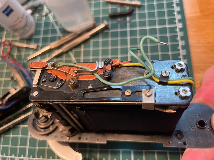 Из сопутствующего был заменен автоспуск (донора дал заказчик), заменен замедлитель выдержек, там храповичок устал, проскальзывал, поставлен целиком из моих запасов.