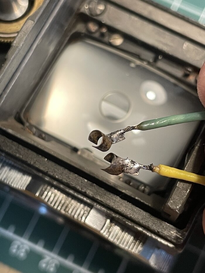 Вообще, чтобы вынуть фотоаппарат надо еще отпаять провода синхроконтакта от контакта на корпусе, но тут их не было вовсе. Оба выхода запараллелили, и убрали лишние провода, таким образом синхронизация "М" здесь отсутствовала.