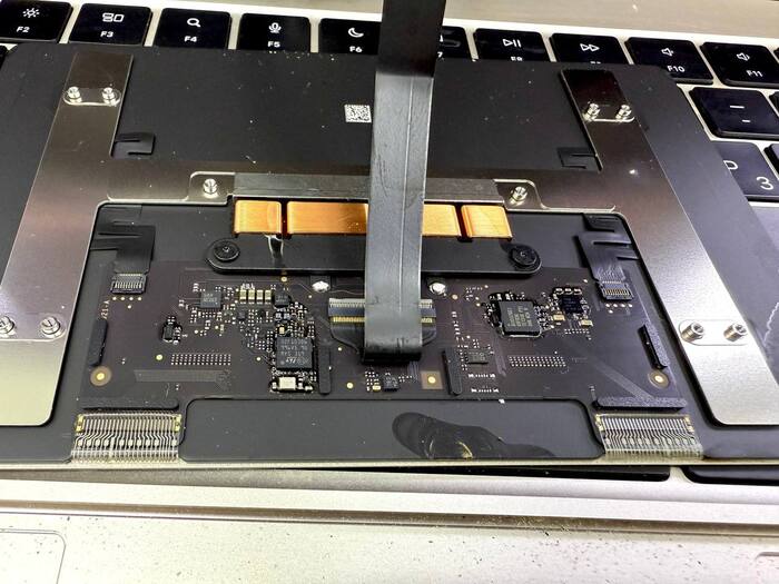 Сняли тачпад, аккуратно прочистили его от следов кофе и установили обратно, выровняв точно так же, как на заводе. Дополнительно очистили разъёмы и все участки, где остались следы жидкости.