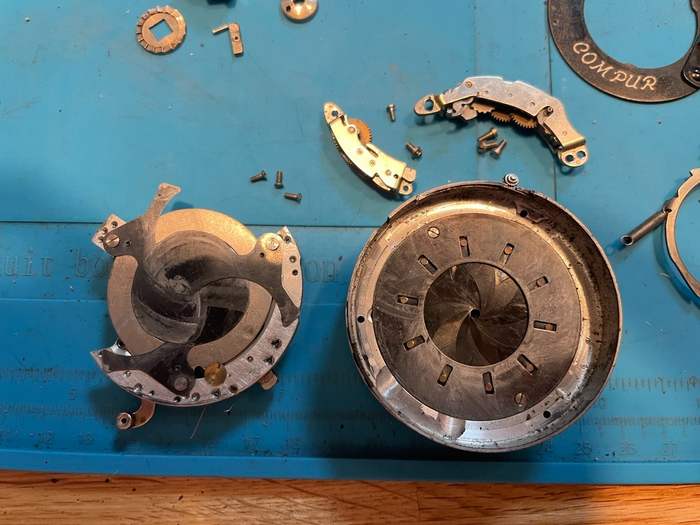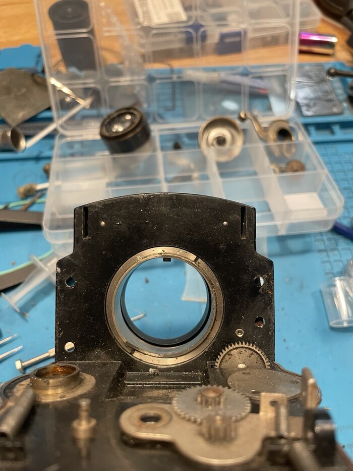 Как и писал в предыдущем посте, попался в руки чехол и очень уставший суперб внутри. Изначально думал что он труп, но все ж дедушка ранний, а потому решил его восстановить с полной разборкой. Счетчик кадров не работал, взвод почти не работал, призмочки напротив шкалы выдержек не было, фокусировочный экран разбит. Ну и песок в узлах фокусировки, все очень туго крутилось.