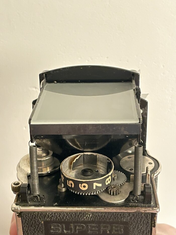Все собрано, шкурки приклеены. Створки шахты видоискателя отрегулированы, пружинками открываются, в разные стороны не распадаются) Облупившуюся черную краску подкрасил перманентным маркером, кожа подкрашена краской по коже. Ржавчина выглядит не так навязчиво на этом фоне, но дает понять что экспонат старый) Фокусировка крутится мягко, теперь мой более молодой суперб невероятно тугой по сравнению с ним.
