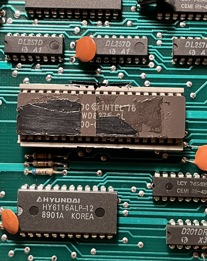 Чип зафиксирован клейкой лентой, предполагаю, от сползания из панельки. Отдирать не стал. Никакой деструкции с ретро: