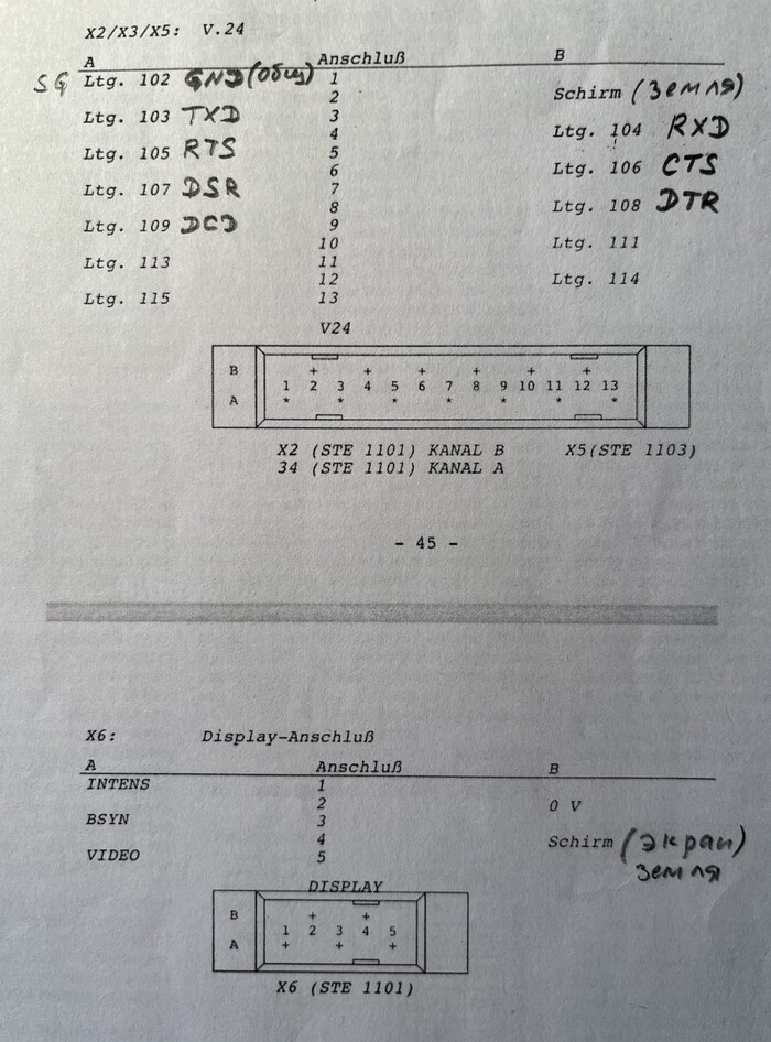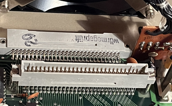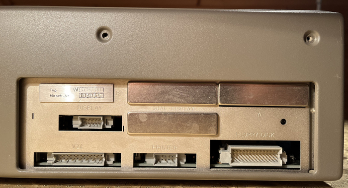 Мы видим разъёмы для подключения дисплея MDA, принтера, внешнего floppy-дисковода и окно во внешний мир — протокол V.24. Благодаря ему мы и сможем почувствовать себя операторами, подключёнными к майнфреймам Всемирной паутины. А вот чем планировалось заменить заглушку под потенциальный разъём GRAF DISPLAY — интересно было бы найти.