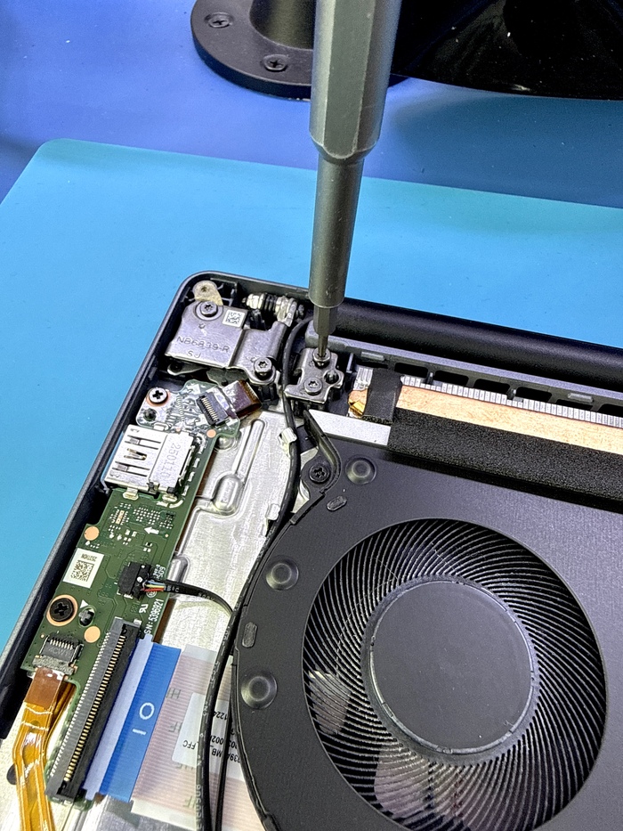 Первым делом — снимаем нижнюю крышку, отключаем шлейф аккумулятора и шлейф матрицы, чтобы работать безопасно, без риска короткого замыкания.
