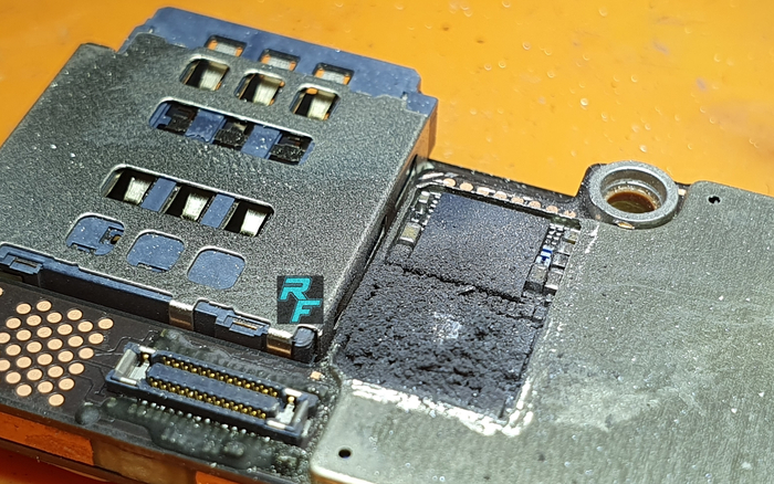 Вот в этом месте мастера поддевают лопаткой плату, тем самым делая не хорошо аккумулятору, но зачем выездной юнит это хотел сделать - хз. При замене шлейфа это не требуется.