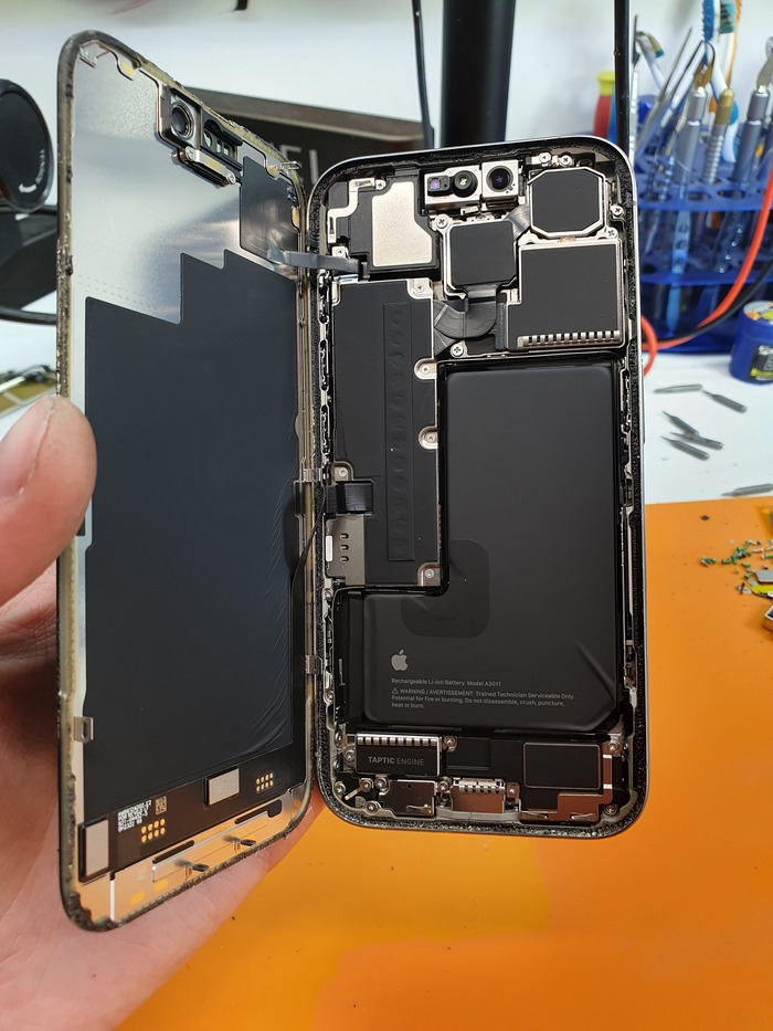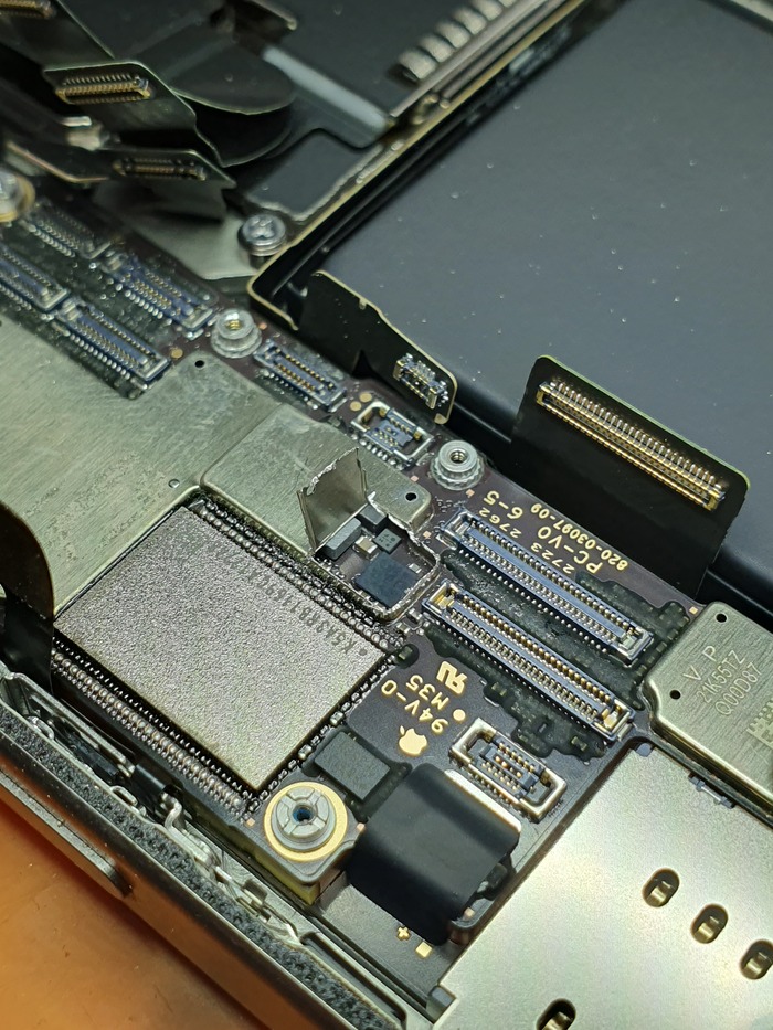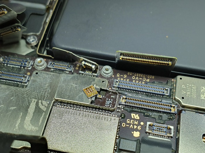 А ничего. Ремонт делаю прямо в титановом корыте, так как в отличие от предыдущих моделей, где эта микра расположена внутри плат, тут она на самом видном и доступном месте: