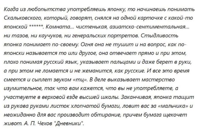 Ходили слухи, что во время путешествия по Сахалину временной японской женой обзавелся и Антон Павлович Чехов. Даже если великий писатель и не жил с мусумэ, то с японской культурой он точно познакомился, о чем оставил весьма хлёсткие воспоминания: