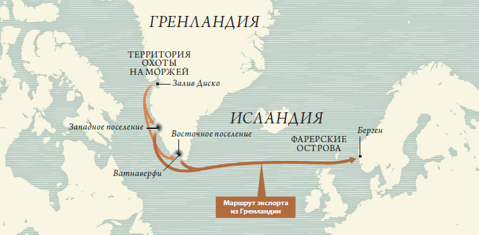 Колонизация Гренландии стала следующим шагом скандинавской экспансии. Около 982–985 годов исландец Эрик Рыжий, приговоренный к изгнанию за убийство, достиг берегов неизвестной земли . Проведя в изгнании три года, он вернулся в Исландию с рассказами о «Зеленой стране» (Гренландии), желая привлечь переселенцев . В 986 году флотилия из 25 кораблей с примерно 700 людьми на борту отправилась к новым берегам. До цели добрались лишь 14 кораблей с 400 колонистам. Исследования показывают, что в период расцвета в гренландских поселениях могло проживать до 6000 человек.