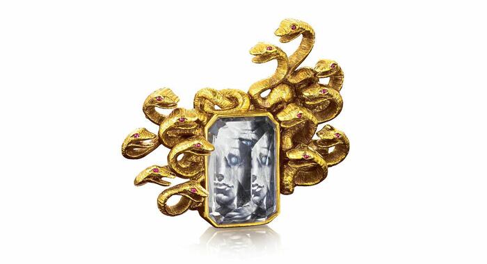 Брошь "Медуза", работы Фулько де Вердура, с изображением лица Медузы на огранённом морганите, рисунок принадлежит Сальвадору Дали, 1941 год.