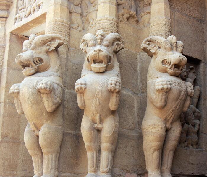 Стоящие яли (мифические составные существа) на стенах храма Кайласанатха. Тамилнад, Индия, династия Паллавов, около 700 г. н. э.