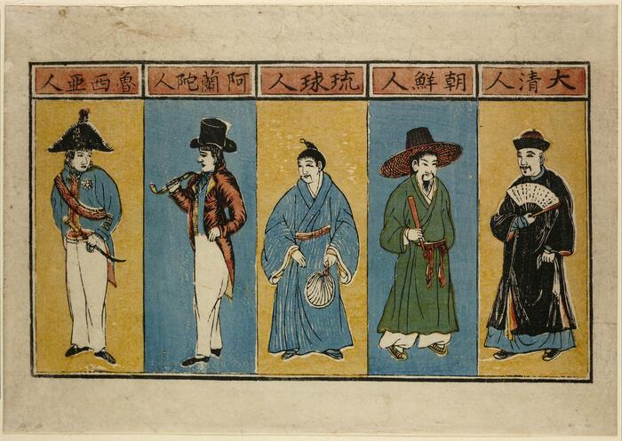 Японская Гравюра с изображением пяти иностранцев. Русский, голландец, рюкюсец (житель островов Рюкю), кореец и китаец. Нагасаки, Япония, период Эдо, около 1800 г. Британский Музей.