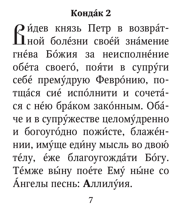 Ви́дев князь Петр в возвра́тной боле́зни свое́й, зна́мение гнева Бо́жия, за неисполне́ние обе́та своего́, поя́ти в супру́ги себе́ прему́друю Февро́нию, потща́ся сие́ испо́лнити и сочета́ся с не́ю бра́ком зако́нным. Оба́че и в супру́жестве целому́дренно и богоуго́дно пожи́сте, блаже́ннии, иму́ще еди́ну мысль во двою́ те́лу, е́же благоугожда́ти Бо́гу. Те́мже вы́ну пое́те Ему́ ны́не со А́нгелы песнь: Аллилу́иа.