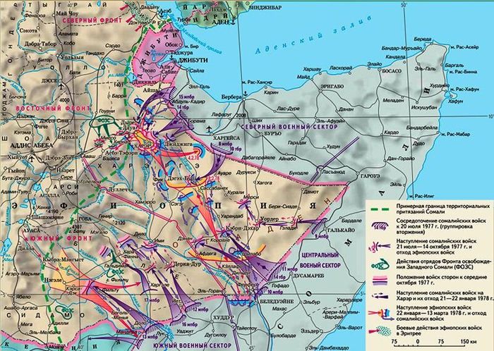 В ноябре 1977 года Сомали разорвала договор о дружбе с СССР и потребовала вывода всех советских специалистов. На их место в Эфиопию хлынул поток военных советников, оружия и техники. Лишь за три месяца в страну было доставлено советской авиацией вооружений на миллиард долларов. Вскоре в Эфиопию прибыли кубинские и южнойеменские подразделения – около 20 тысяч бойцов, направленных в рамках интернациональной помощи.