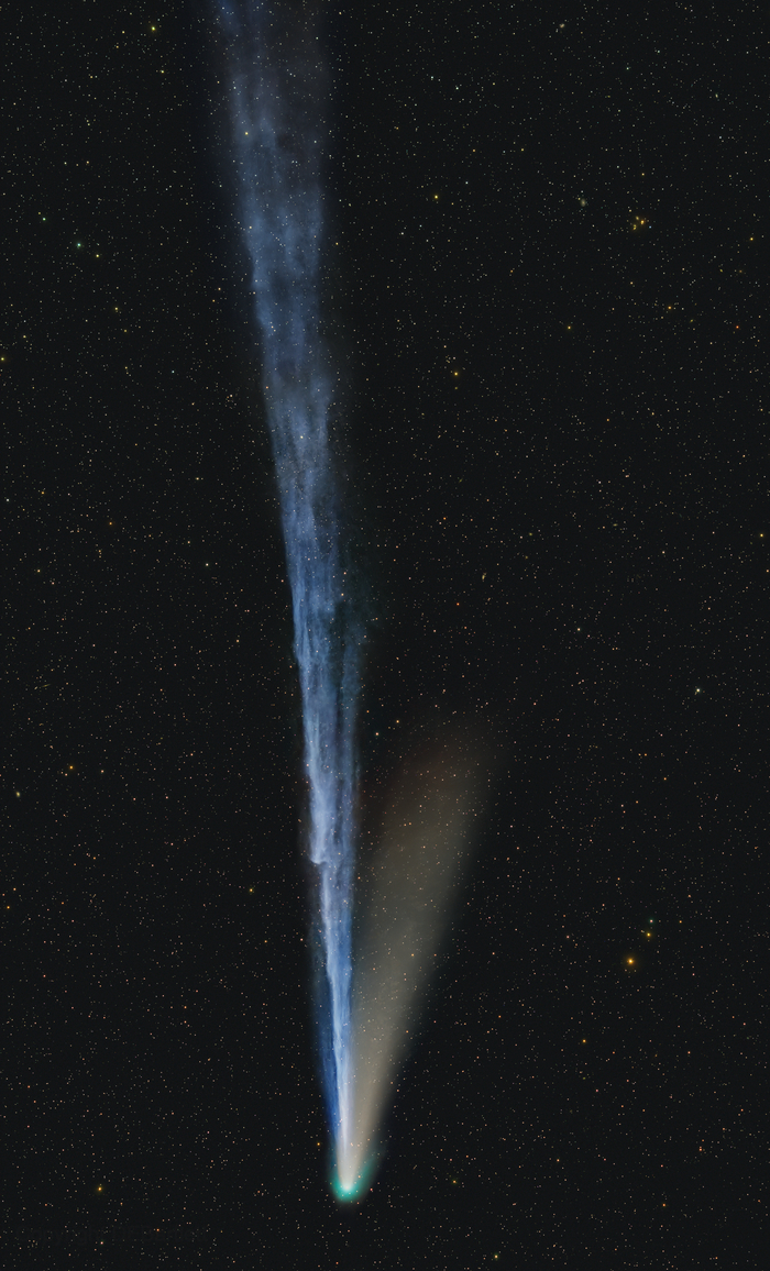 У некоторых комет помимо газового (голубоватого прямого) хвоста может появиться пылевой (белый изогнутый), а может и не появиться. В этот раз я угадал.Более подробно мой прогноз движения кометы и развития её хвостов в динамике можно посмотреть в видео, прикреплённом к посту: Самая яркая комета октября: C/2025 A6 (Lemmon).