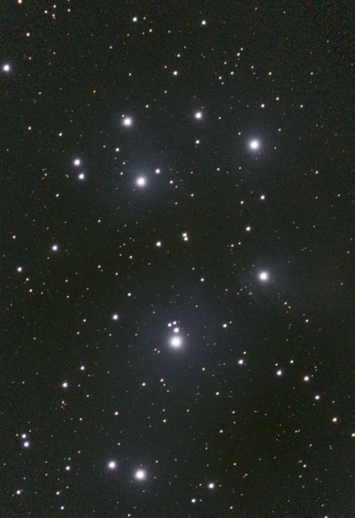 В кадр поместился и Уран -- газовый гигант, который находится в 1.400.000 раз ближе, чем Плеяды, но всё равно видится с Земли гораздо меньше звёздного скопления.