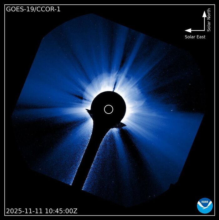 Выброс от вспышки Х5.29 на снимках коронографа GOES-19.