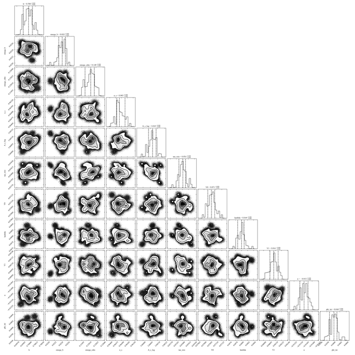 Анализ методом Монте-Карло Маркова позволил получить одномерные и двухмерные маргинализованные апостериорные распределения для 11 параметров гибридной скалярной полевой модели, отображенные на диаграмме угловых корреляций.