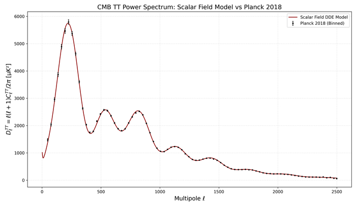 Лучшая оценка, полученная из гибридной скалярной полевой модели, прекрасно соответствует угловому спектру мощности температурных флуктуаций космического микроволнового фона (CMB TT), представленному данными Planck 2018 (черные точки с погрешностями).