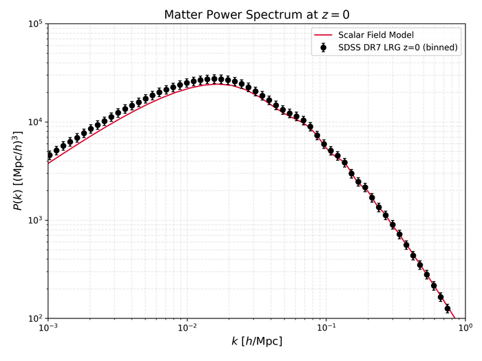 Предсказания наилучшей модели демонстрируют отличное соответствие наблюдаемым данным выборки LRG из SDSS DR7 (черные точки) для спектра мощности материи P(k) при красном смещении z=0.
