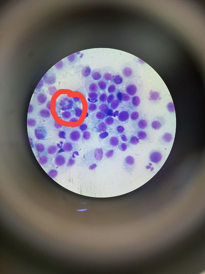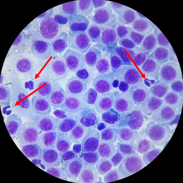 Множественные вакуоли по периферии клеток (белые кружочки) - один из самых характерных цитологических признаков TVС. Считается, что вакуоли являются результатом нарушения метаболизма липидов в опухолевых клетках или следствием дистрофических изменений. Их периферическое расположение помогает отличить TVС от других круглоклеточных опухоль, таких как лимфома (клетки которой обычно имеют более гомогенную цитоплазму) или плазмоцитома.