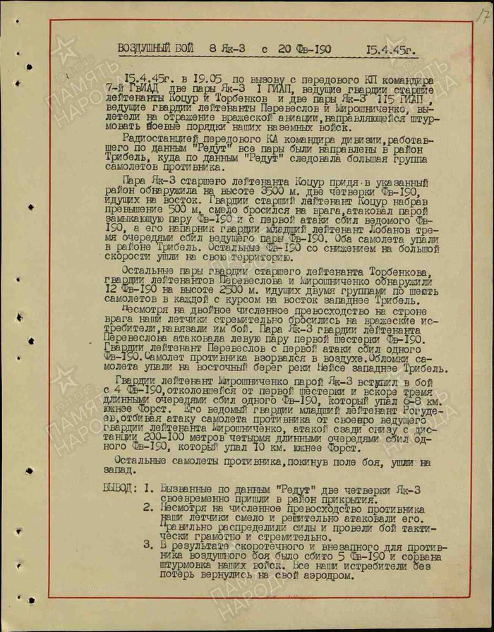 Здравствуйте Уважаемые читатели! Сегодня я хочу рассказать про бой, который провели советские летчики на самолётах Як-3 в самый канун Берлинской операции. Данная машина впервые схлестнулась с противником летом 1944 года и отлично противостояла как, например, Фоккерам, о которых пойдет речь дальше, так и хорошо известным нам Мессерам. Причем Як-3 стал одним из самых лёгких истребителей Второй Мировой Войны. Итак, вечером 15 апреля 1945 года радиолокационная станция РУС-2 Редут, которая начала выпускаться ещё до войны, фиксирует в небе появление вражеской авиации. Поэтому пары гвардии старших лейтенантов Коцура и Торбенкова из 1-й гв ИАП и пары гвардии лейтенантов Перевеслова и Мирошниченко из 115-го гв ИАП вылетают на перехват противника в районе населенного пункта Трибель, достигнув района которого пара Коцура и Торбенкова на высоте в 3.5 километра замечают две четверки Фоккеров.