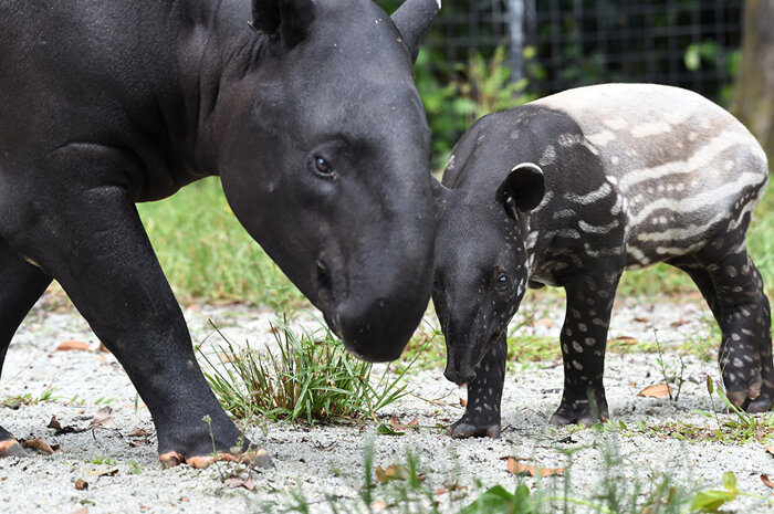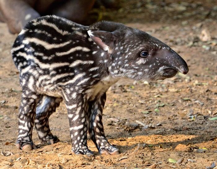 Результатом любви становится долгая беременность – одна из самых длительных среди всех копытных: целых 13 месяцев. Зато новорожденный тапирёнок очень крепкий и сразу готов следовать за матерью. Окрас у малышей, кстати, сильно отличается от взрослых тапиров.