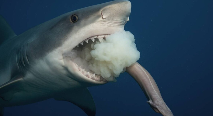 Миксина это вам не просто морской шланг. Она умеет защищаться так, как ни одно другое существо. Акула, которая по ошибке схватила мексину была совсем не рада такому повороту событий. Тело миксины вывернулось в сторону. Почти не сопротивляясь, мягкое, вялое, как будто не живое. Слизь, вязкая, как гель заполнила ротищу хищницы.