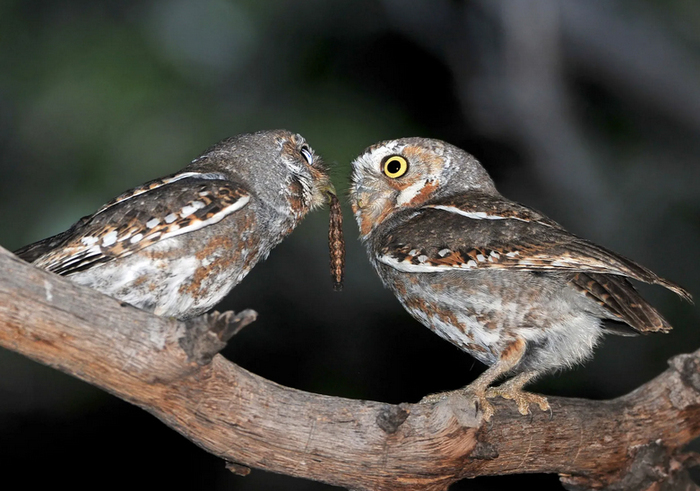 А во время брачного сезона самец ухаживает за самкой как настоящий рыцарь: поёт ей сладкие серенады и кормит отборными вкусняшками. В конце весны сычики откладывают от 2 до 5 яиц, и высиживать их придётся около трёх недель. В отличие от других видов сов, самка сыча-эльфа иногда охотится по ночам в период насиживания, и в это время о яйцах заботится её партнёр. Но этим роль папаши не ограничивается. Когда вылупятся птенцы, то выкармливать их будет мама, но вот приносить необходимую пищу – задача папы. И пищи нужно много! В разгар охоты самец может возвращаться к гнезду с добычей очень часто, примерно раз в минуту.