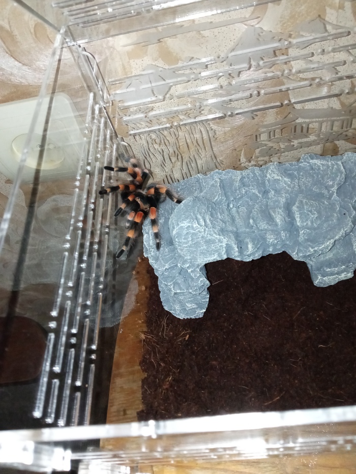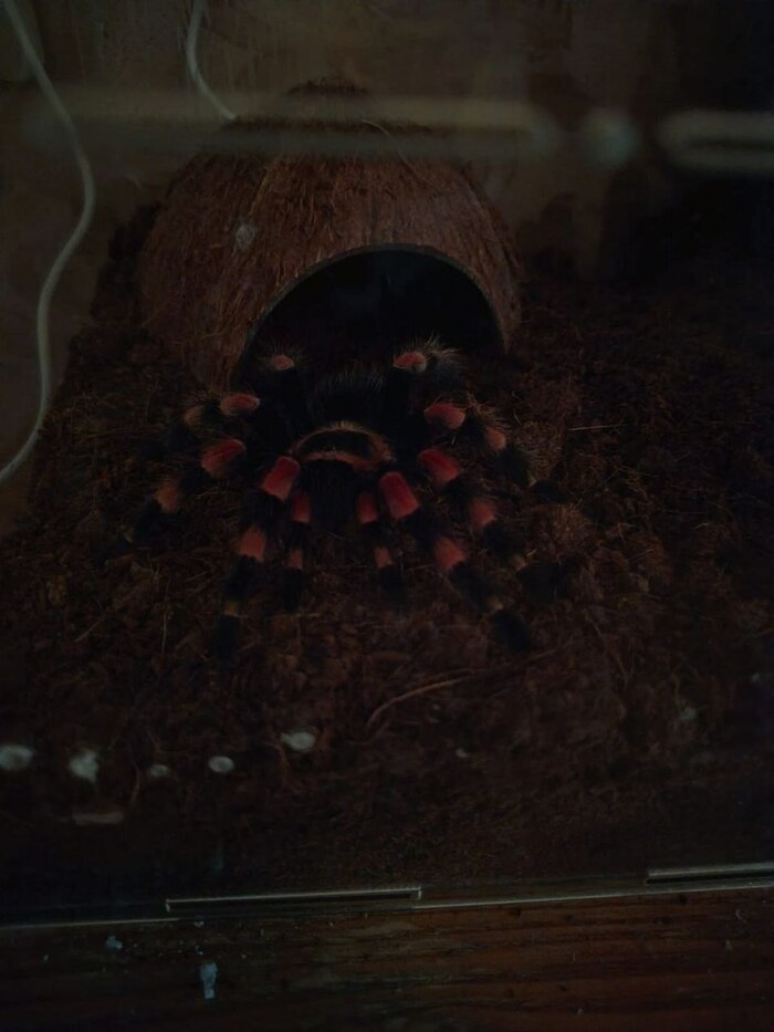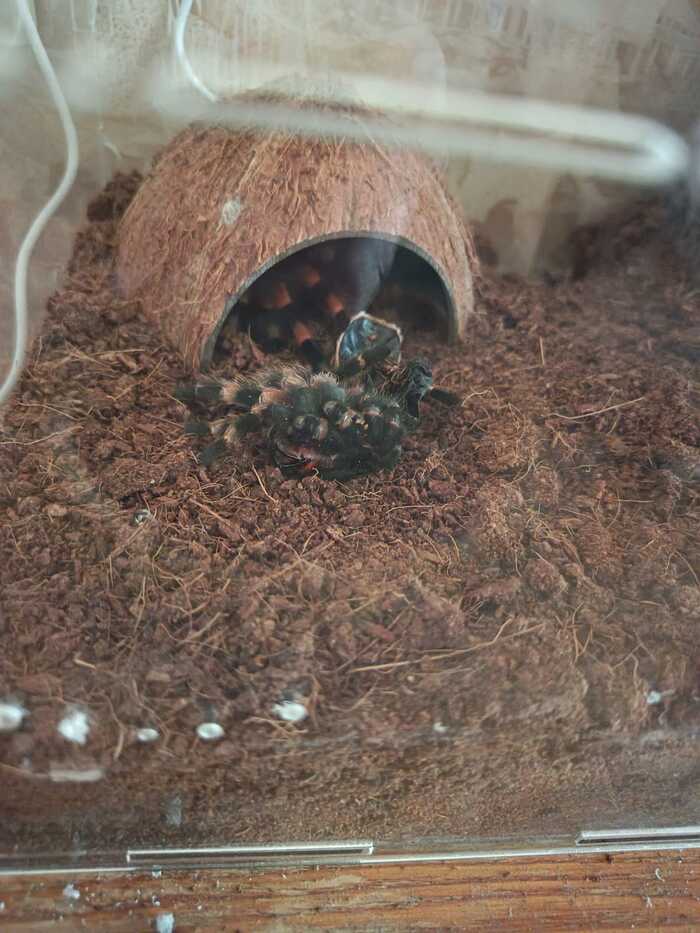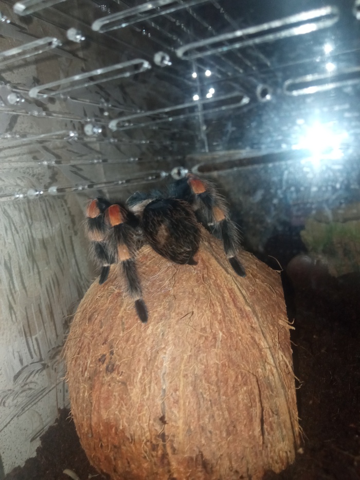 Цепкость лапок пушистика не бесконечна и имеет свойство изнашиваться. По началу, видя, как Лора скользит и падает на субстрат, я запереживала. Но позже, изучив особенности птицеедов, поняла — это абсолютная норма, а возможность вновь ползать по вертикальным поверхностям вернётся к ней уже после сбрасывания старой шкурки. Главное — в этот период убрать из террариума острые предметы (потому пришлось сменить каменную пещерку Лорейн на обычный мягкий кокос).Когда место, лишённое волосков, начнёт из телесного цвета постепенно окрашиваться в чёрный — ваш паук готов линять и сделает это в ближайшую неделю.