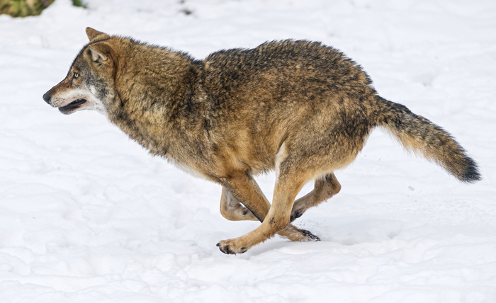 Однако в исключительно редких случаях этого не происходит, и взрослый волк сохраняет голубой цвет глаз.6. При необходимости волк развивает скорость около 60 км/ч и способен делать переходы до 60-80 км за ночь.