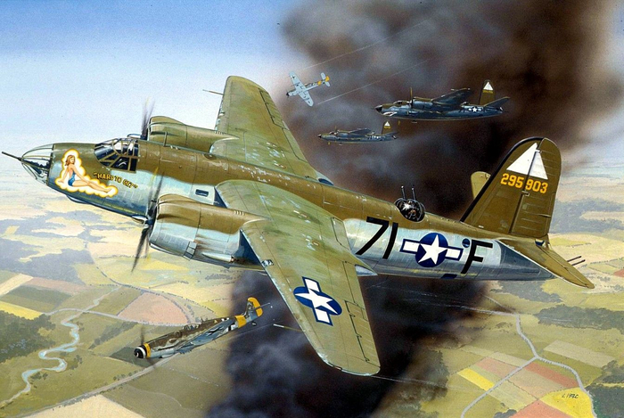В-26 ведет огонь по атакующим ее немецким истребителям